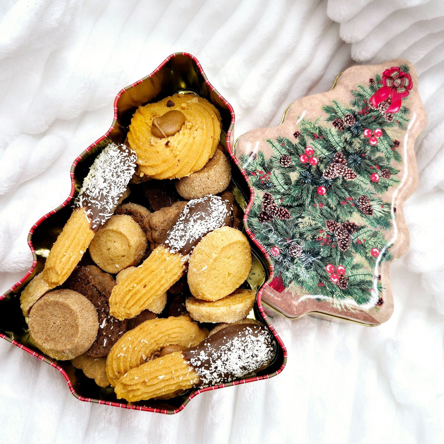 Ingrédients : farine de BLÉ, BEURRE, sucre roux, sucre glace, sucre semoule, gianduja (pâte de cacao, sucre, beurre de caco, NOISETTES, poudre de LAIT entier et écrémé, lécithine de SOJA), AMANDES en poudre, NOISETTES en poudre, farine de chataigne, OEUFS, cacao en poudre, chocolat noir et au LAIT (sucre, beurre de cacao, poudre de LAIT, pâte de cacao, lécithine de SOJA, arôme vanille), NOIX DE COCO, pâte de citron, pâte d'orange, mélange 4 épices, cannelle, vanille, sel.