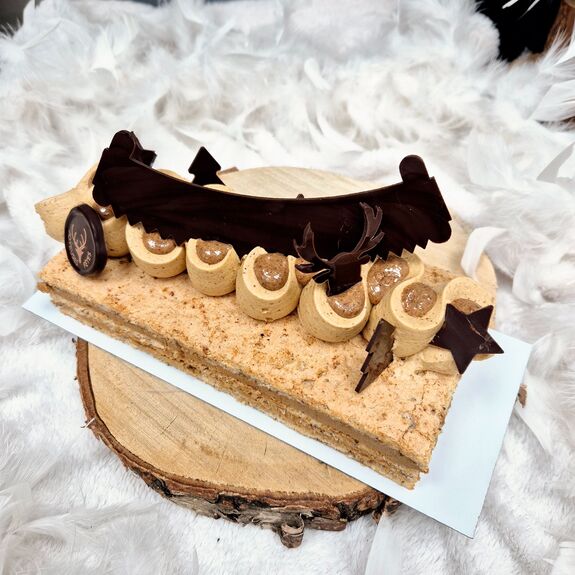 Cette bûche est retravaillée dans sa forme et dans son goût avec une belle association de café et de noisettes de Lectoure. Elle saura séduire, on l'espère, les adeptes des bûches au beurre traditionnelles.