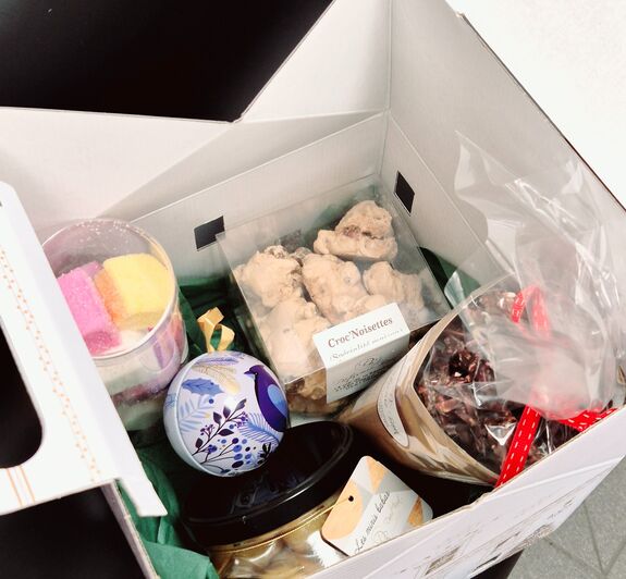 Un assortiment de plusieurs produits tels des biscuits, des chocolats et des confiseries rempliront généreusement ce coffret aux couleurs de fêtes, comme l'exemple en photo (valeur : 55 € coffret compris)