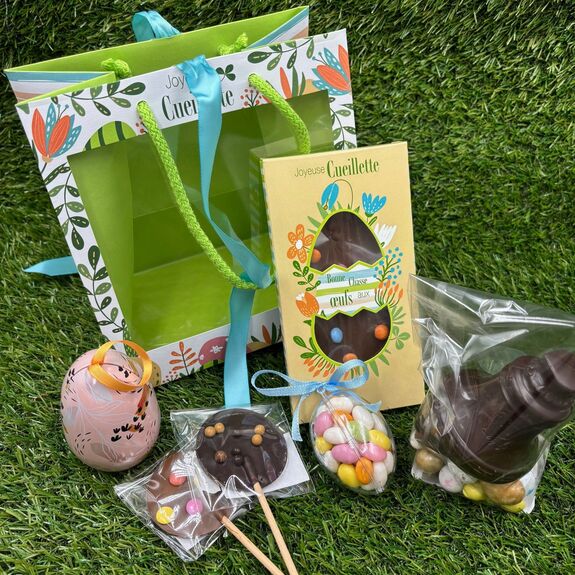 Un panier riche de surprises chocolatées, idéal pour vos tout-petits : des produits à cacher dans le jardin et un cabas pour aller les chercher...