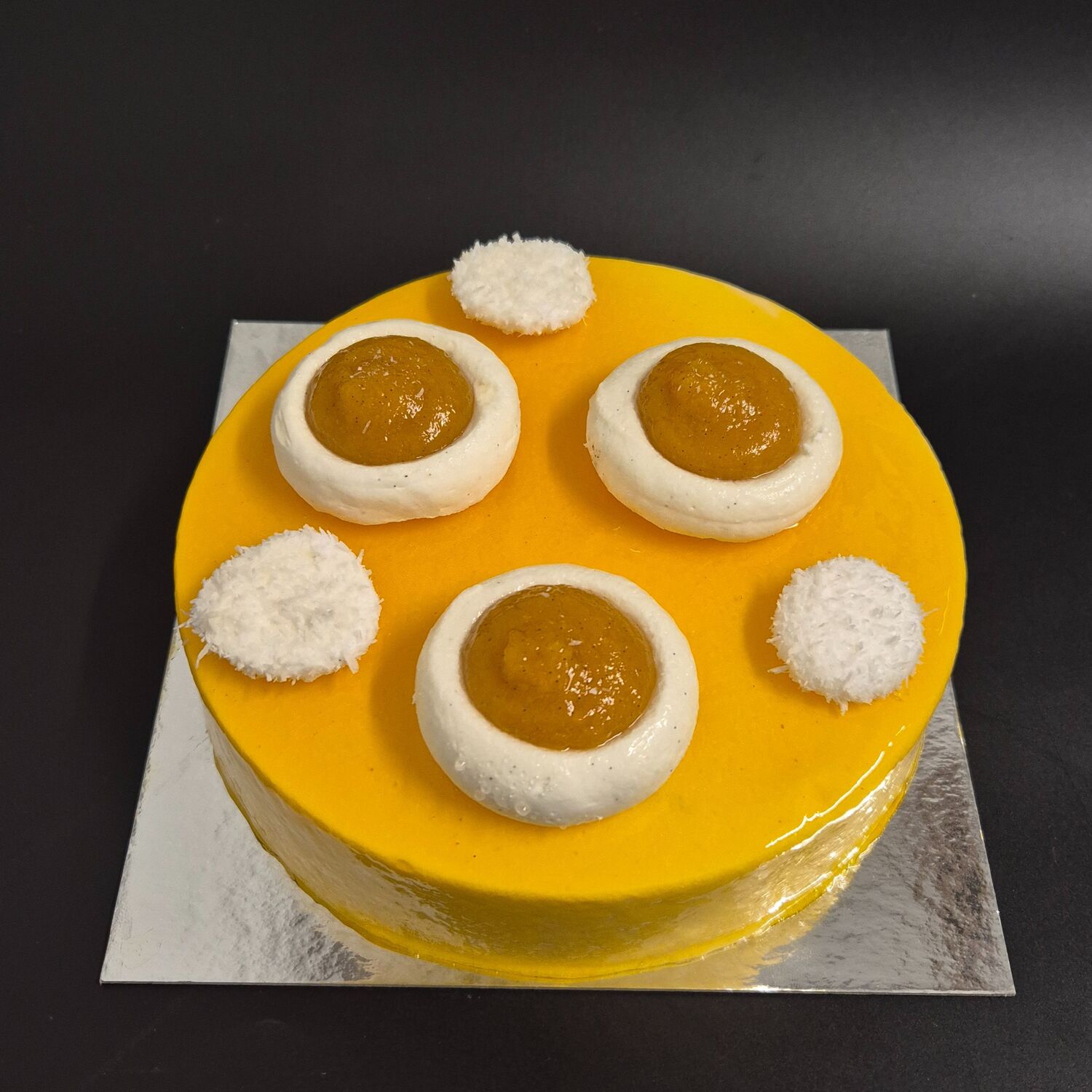 Biscuit croustillant spéculoos, crémeux fruits de la passion, gelée abricot et mousse abricot
